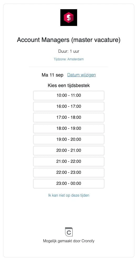 Dankzij realtime scheduling van Cronofy in Ubeeo leg je de bal bij de kandidaat. Kandidaten plannen een tijdstip dat hen uitkomt. Vooraf stellen interviewers zelf in wanneer ze beschikbaar zijn, dus uit welke momenten kandidaten kunnen kiezen.