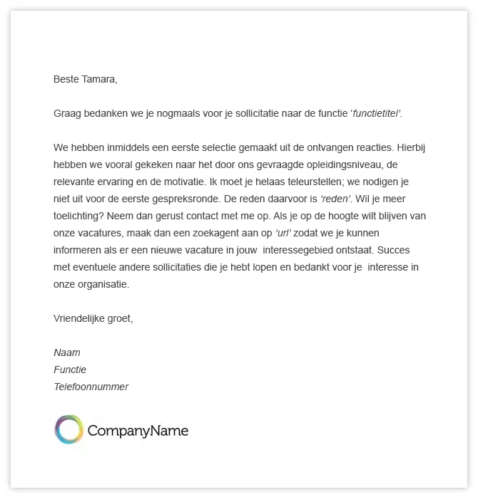 Ook uitnodigingen voor gesprekken, vragen om extra informatie en zeker afwijzingen, zijn medebepalend voor het gevoel dat je achterlaat bij een sollicitant. Geef bijvoorbeeld in een uitnodiging wat tips voor de voorbereiding van een gesprek en vermeld vast wanneer er terugkoppeling wordt gegeven. Een sollicitant afwijzen moet ook netjes en informatief: Geef in een afwijzingsbrief (meestal een email natuurlijk!) duidelijk uitleg waarom de kandidaat is afgewezen of geef de mogelijkheid om toelichting te vragen. Zeker als een kandidaat op gesprek geweest is, is het wel zo persoonlijk om de afwijzing telefonisch te doen. De afwijzing per mail, dient dan natuurlijk alleen nog ter bevestiging. Bedank de sollicitant altijd voor de moeite en wens hem of haar succes met het vinden van een nieuwe baan. Vergeet nooit dat de sollicitant van vandaag ook best een (toekomstige) klant kan zijn of iemand die over een tijd wel past bij je organisatie… Houd dat voor ogen bij het opstellen van je mails! We hebben hier een voorbeeldbrief afwijzing sollicitatie waar je zelf tussen de komma’s dan informatie bij kunt invullen. Via ons recruitmentsysteem stuur je snel en eenvoudig dit soort gepersonaliseerde afwijzingen.