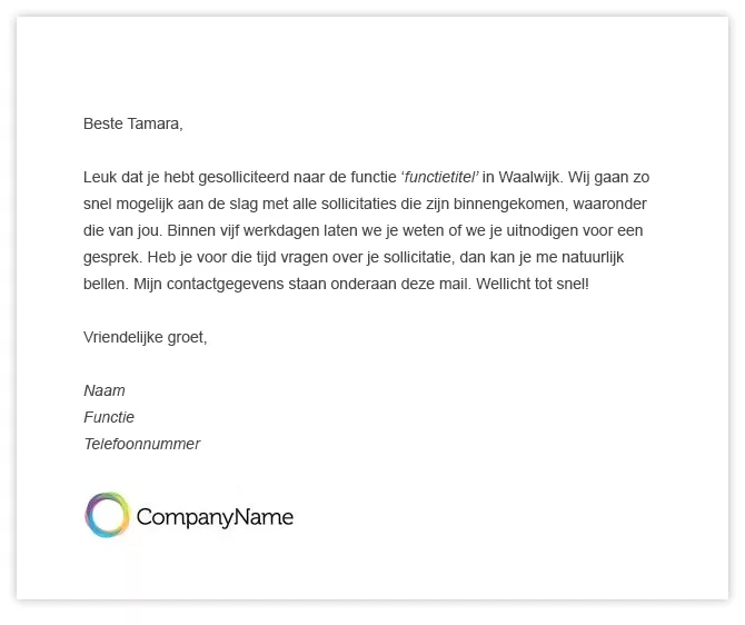 De mail die verstuurd wordt na binnenkomst van een sollicitatie, bevat idealiter meer informatie dan de bedanktekst op het scherm. Geef in de bevestigingsemail een korte uitleg over de sollicitatieprocedure en binnen hoeveel dagen de kandidaat een reactie kan verwachten. Het is belangrijk dat de kandidaat de mogelijkheid heeft om te reageren; een no-reply emailadres is vervelend en geeft geen welkom gevoel. Zorg ook voor een ondertekening met een persoonlijke naam, een emailadres en een telefoonnummer, zodat de kandidaat contact op kan nemen.