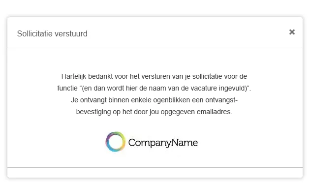 Wat wij bij Ubeeo altijd aanraden aan onze klanten, is om direct na de sollicitatie een ‘bedanktekst’ op het scherm te tonen. Zo weet de sollicitant dat het formulier verzonden is en dat hij een mail ontvangt. Hij kan dan ook contact opnemen als hij de mail onverhoopt niet ontvangt.